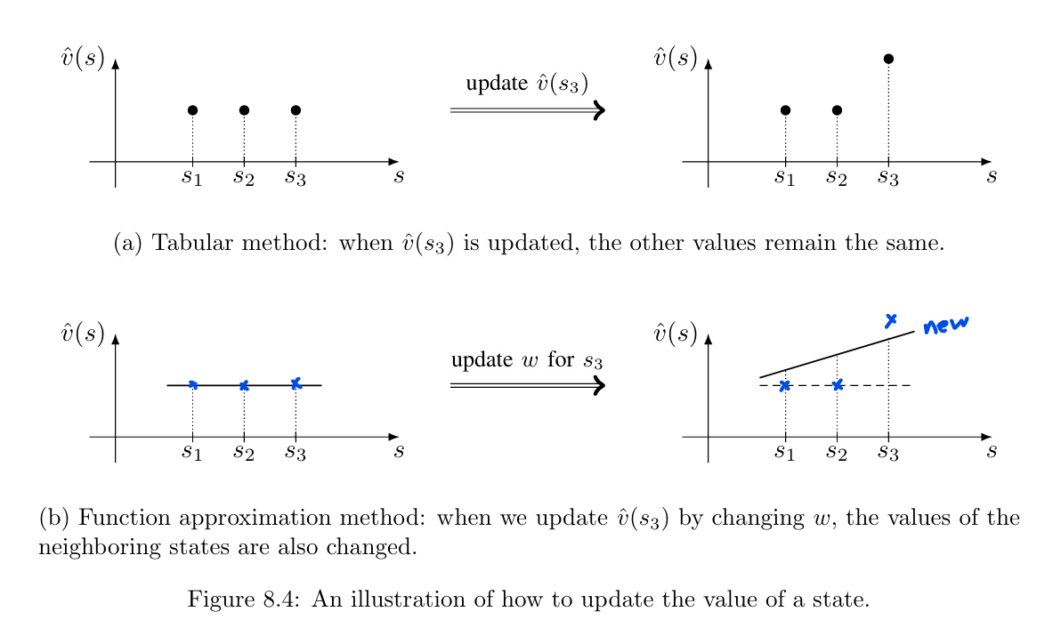 | update a value: directly rewrite the corresponding entry in the table. | update a value : update $w$ to change the values indirectly. | the function approximation method has another merit: its generalization ability is stronger than that of the tabular method. |