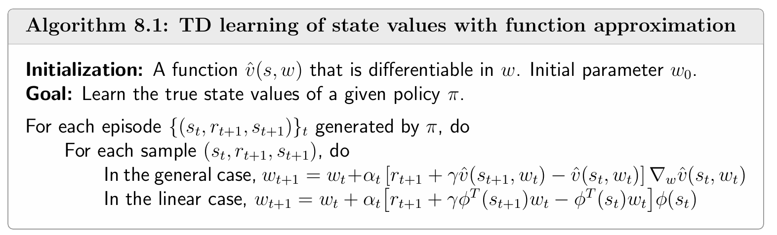 Understanding the TD learning with function approximation is important for studying the section 8.3. Notably, this equation can only learn the state values of a given policy. It will be extended to algorithms that can learn action values in Sections 8.3.