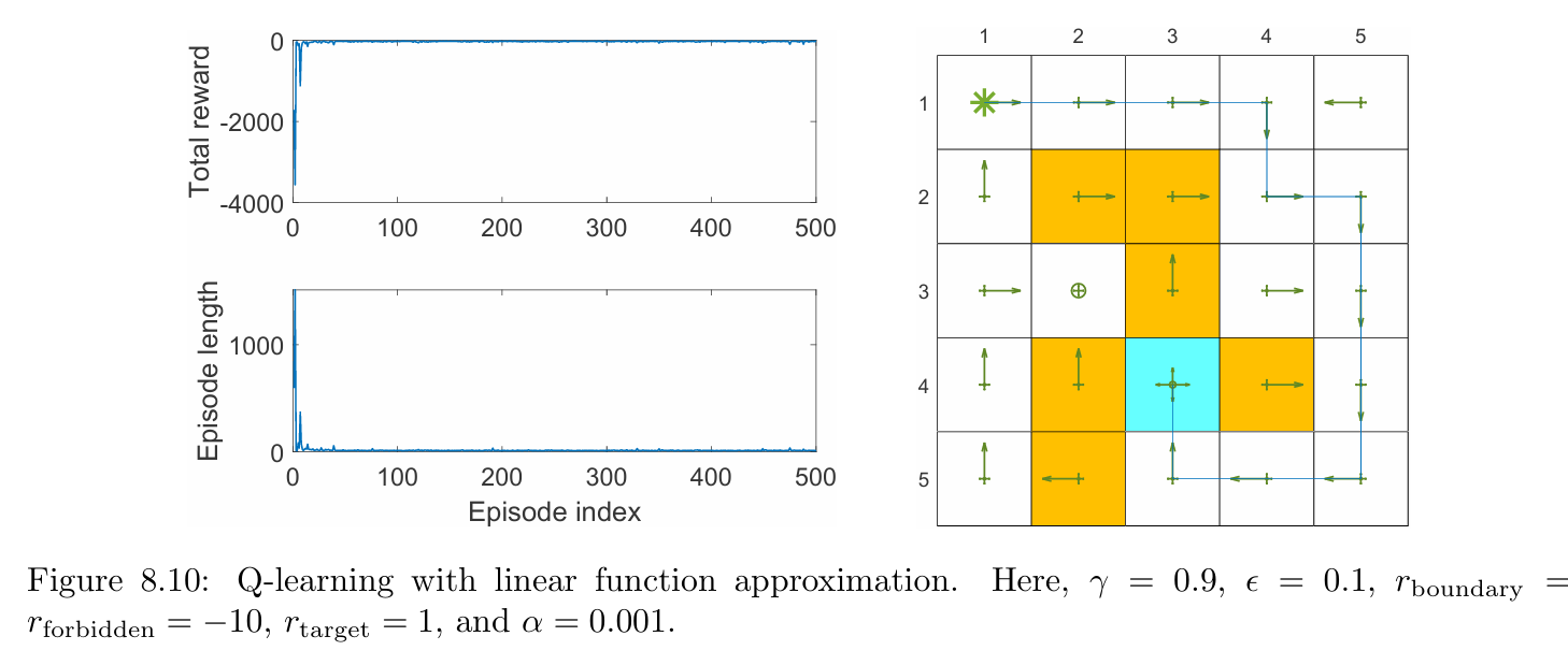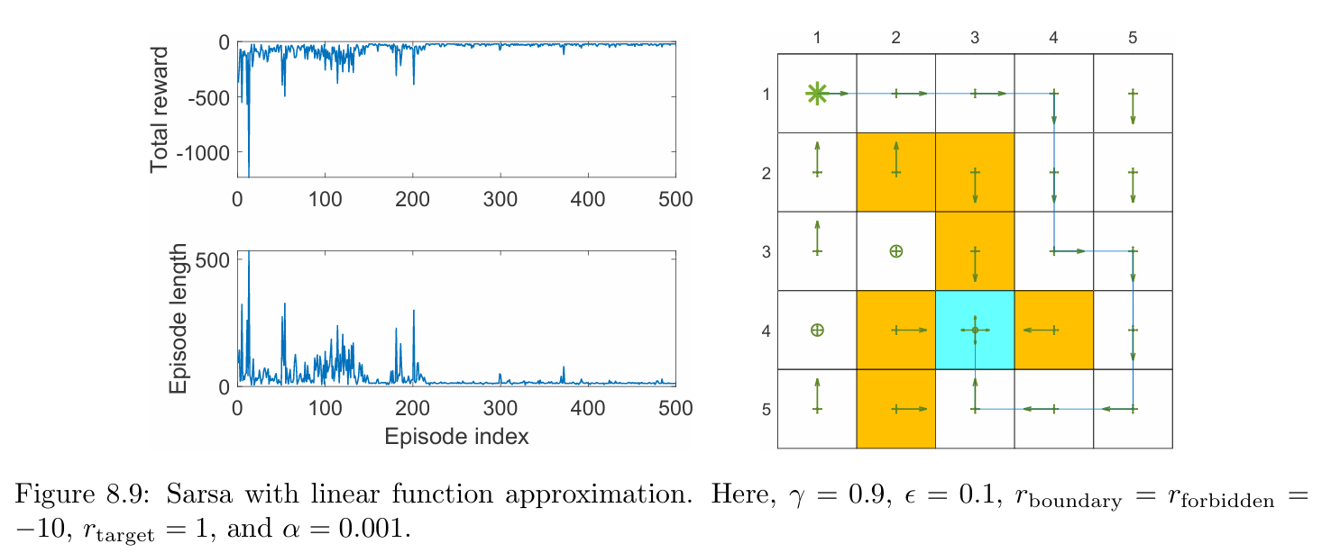 An illustrative example is shown in Figure 8.9. In this example, the task is to find a good policy that can lead the agent to the target when starting from the top-left state. Both the total reward and the length of each episode gradually converge to steady values. In this example, the linear feature vector is selected as the Fourier function of order 5. The expression of a Fourier feature vector is given in the above equation.