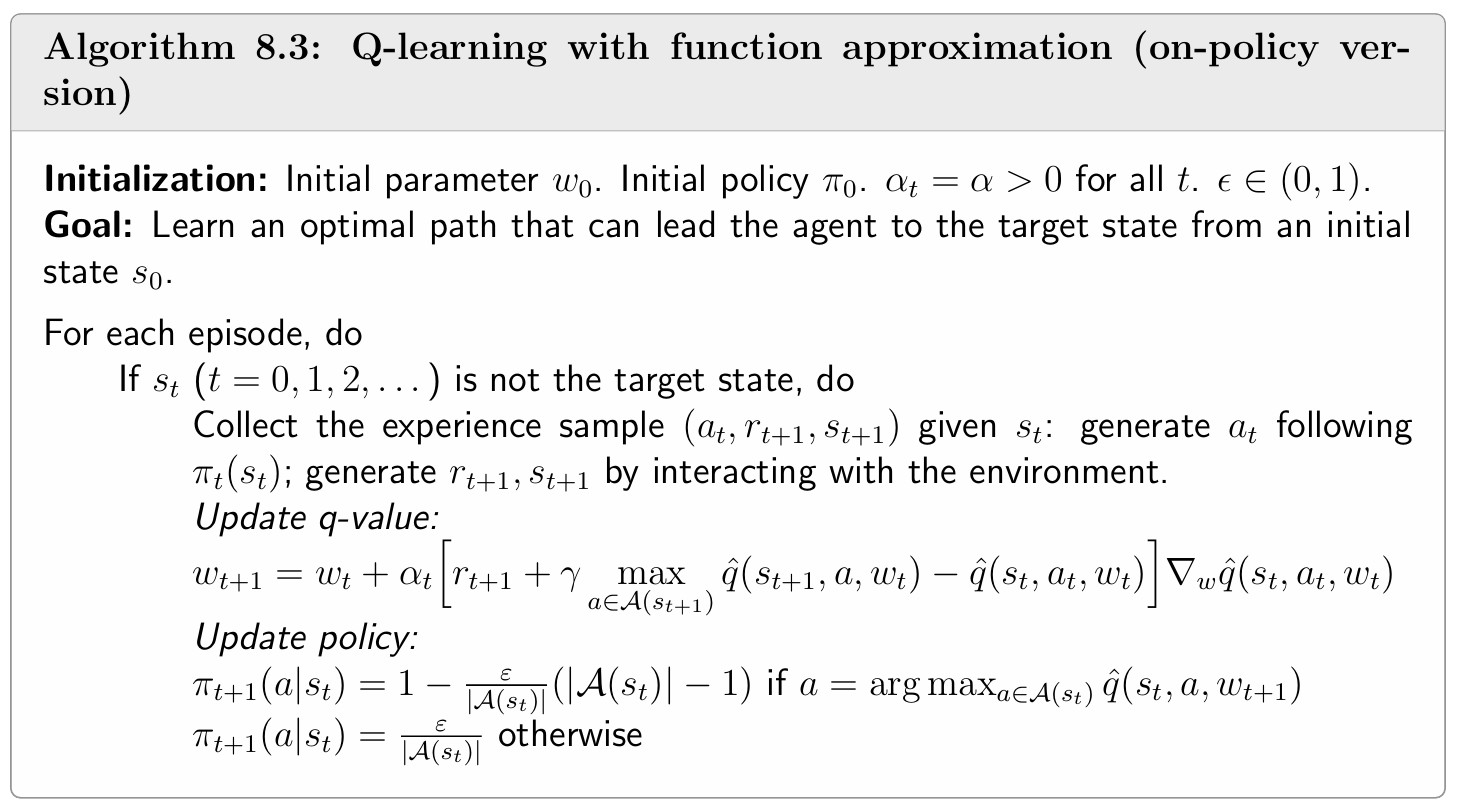 One may notice in Algorithm 8.2 and Algorithm 8.3 that, although the values are represented as functions, the policy $\pi(a|s)$ is still represented as a table. Thus, it still assumes nite numbers of states and actions. In Chapter 9, we will see that the policies can be represented as functions so that continuous state and action spaces can be handled.