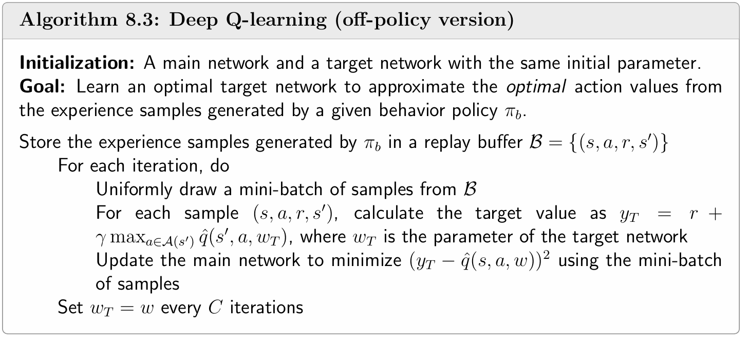 The implementation procedure of deep Q-learning is summarized in Algorithm 8.3. This implementation is off-policy. It can also be adapted to become on-policy if needed.