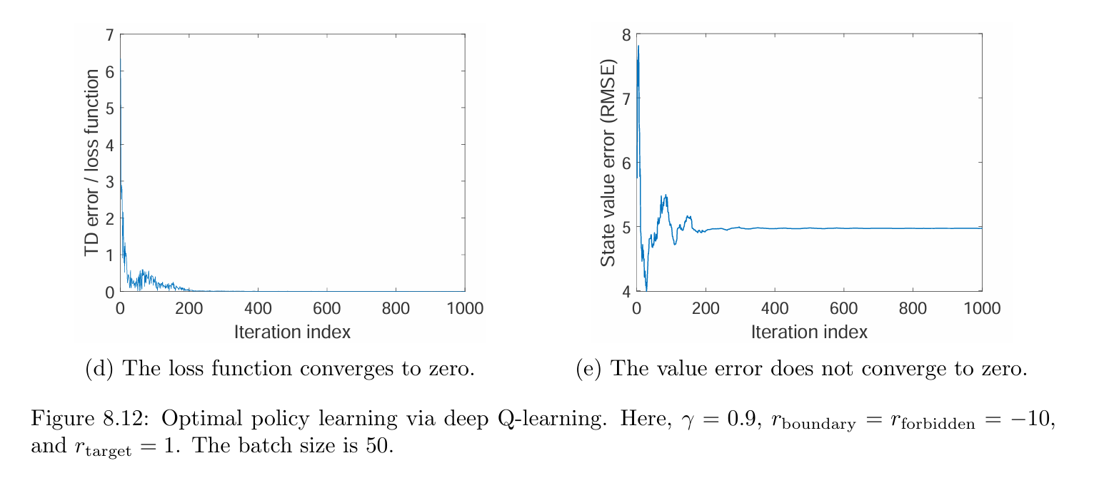 As shown in Figure 8.11(d), the loss function, defined as the average squared TD error of each mini-batch, converges to zero, meaning that the network can fit the training samples well. As shown in Figure 8.11(e), the state value estimation error also converges to zero, indicating that the estimates of the optimal action values become sufficiently accurate. Then, the corresponding greedy policy is optimal.