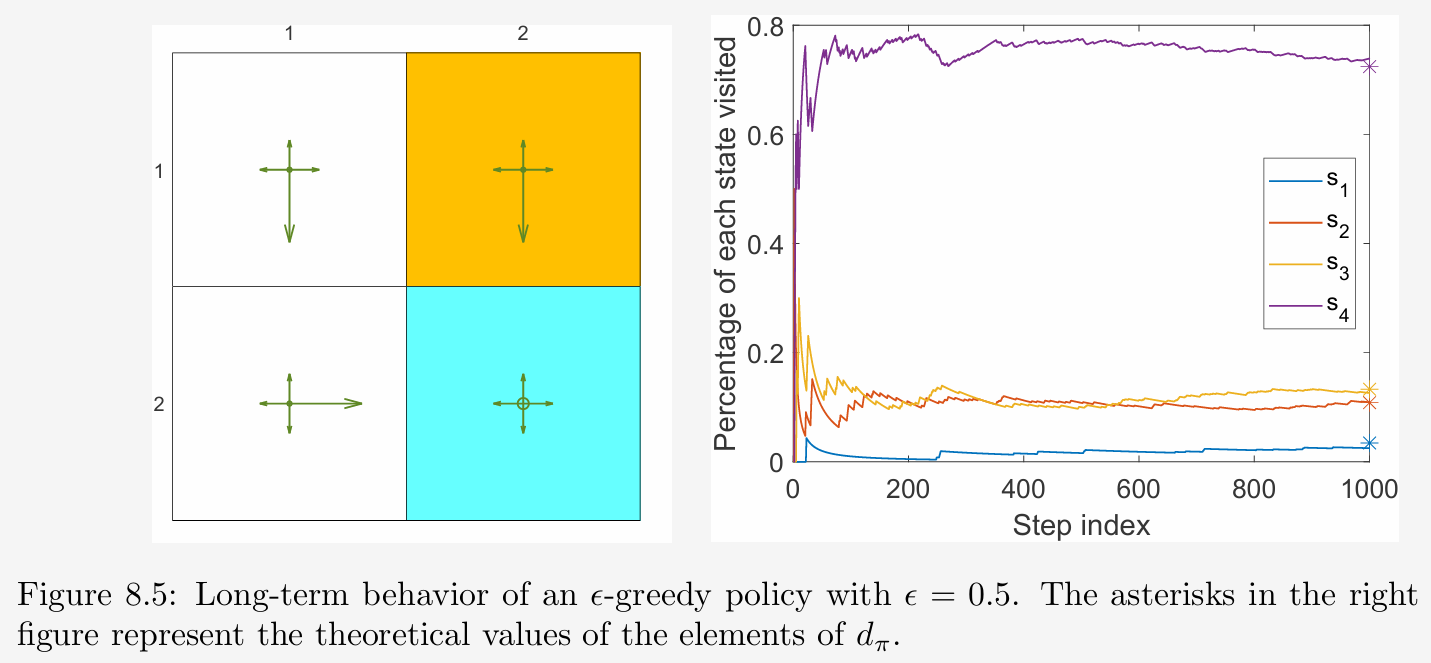 — (2) The second method is to estimated $d_{\pi}$ numerically. we start from an arbitrary initial state and generate a sufficiently long episode by following the given policy. we select $s_1$ as the starting state and run 1000 steps by following the policy. The proportion of the visits of each state during the process is shown in the below Figure( represent the theoretical value of $d_{\pi}(s_i)$). *It can be seen that the proportions converge to the theoretical value of $d_{\pi}$ after hundreds of steps. It is clear clarify that the experience samples are collected by the behavior strategy, which inherently have the meaning of $d_{\pi}(s)$.