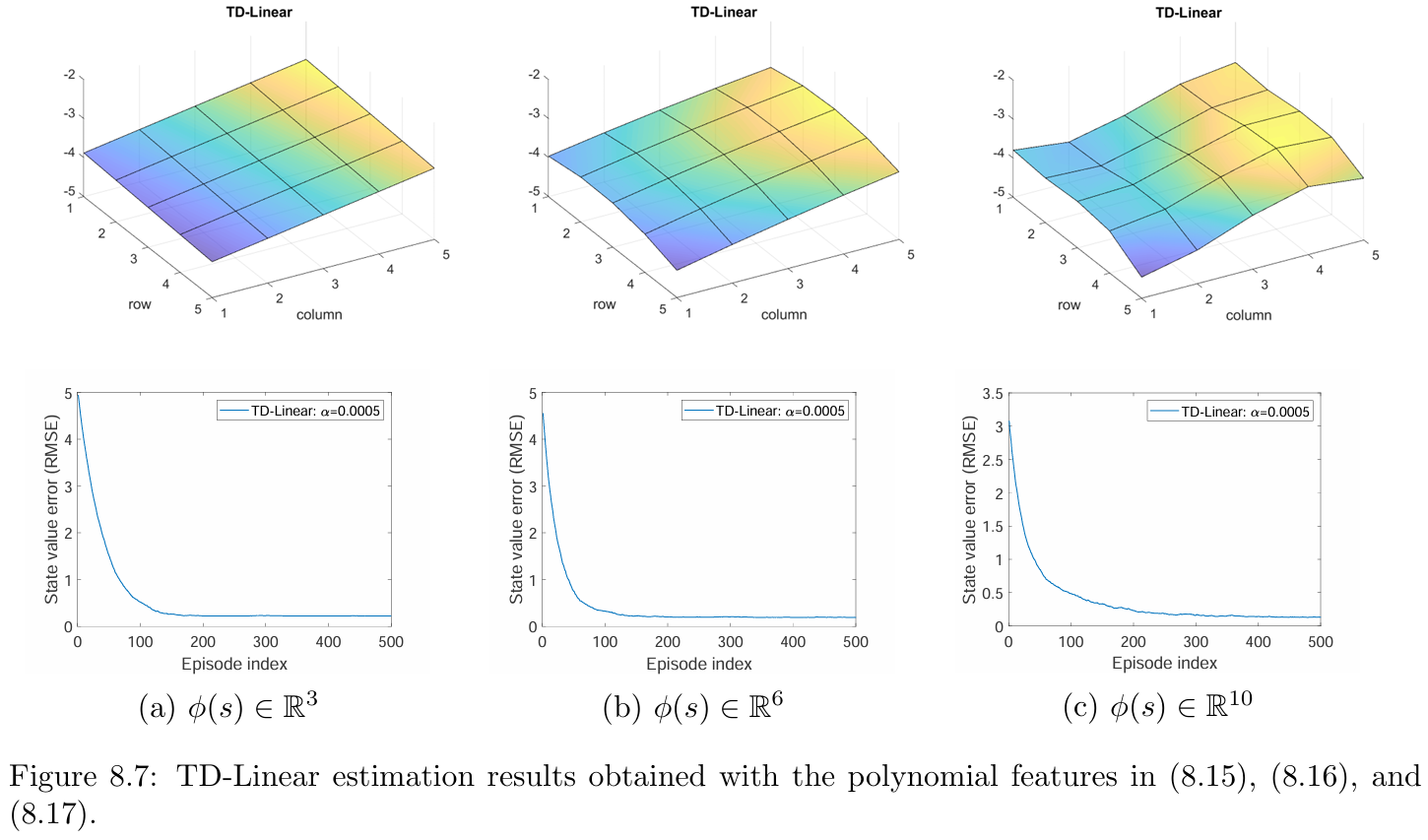 - 3.1) TD-Linear: use a linear function,we need to select appropriate feature vectors. (Section 8.2.3: the based TD algorithm; section 8.3: sarsa\Q-learning);