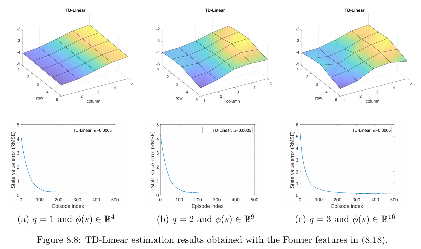 An illustrative example is shown in Figure 8.9. In this example, the task is to find a good policy that can lead the agent to the target when starting from the top-left state. Both the total reward and the length of each episode gradually converge to steady values. In this example, the linear feature vector is selected as the Fourier function of order 5. The expression of a Fourier feature vector is given in the above equation.