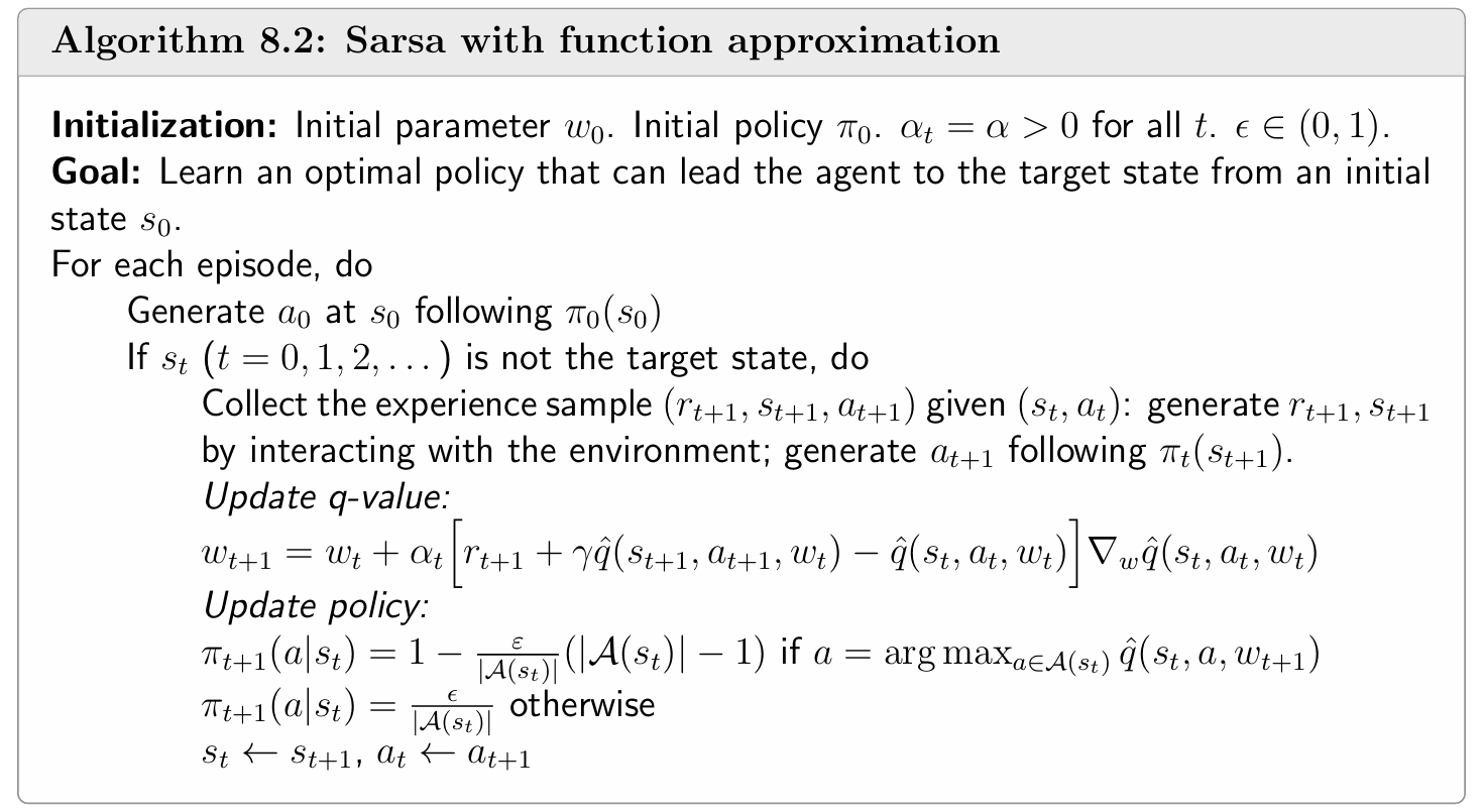 One may notice in Algorithm 8.2 and Algorithm 8.3 that, although the values are represented as functions, the policy $\pi(a|s)$ is still represented as a table. Thus, it still assumes nite numbers of states and actions. In Chapter 9, we will see that the policies can be represented as functions so that continuous state and action spaces can be handled.