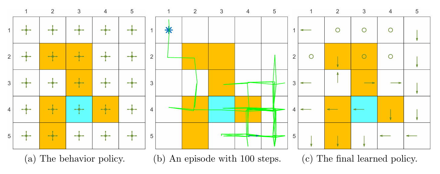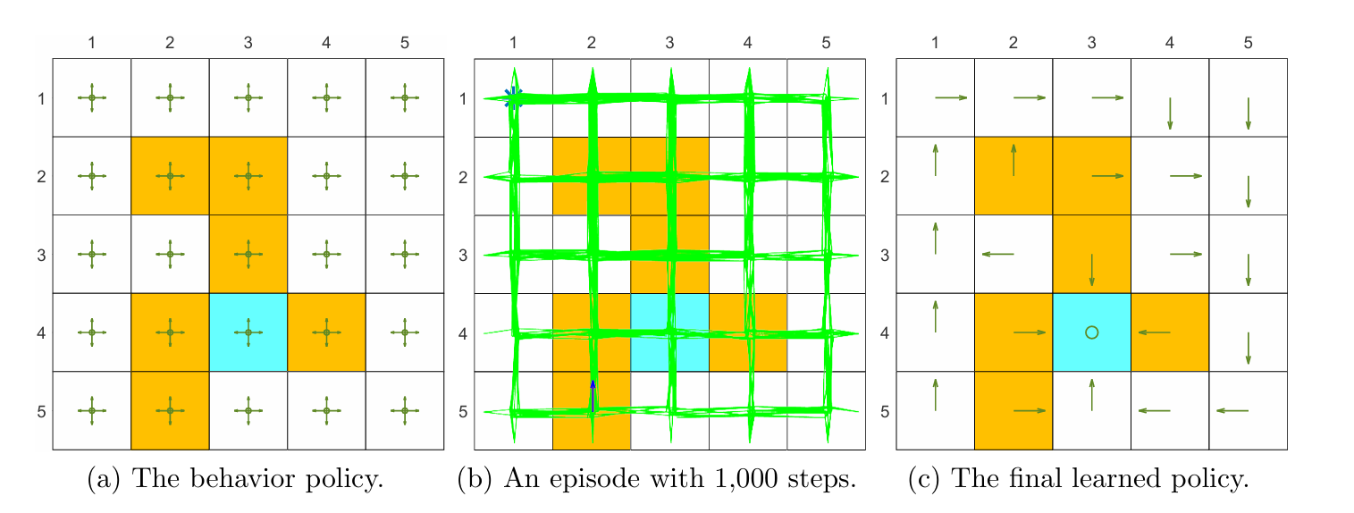 A single episode is generated by the behavior policy shown in Figure 8.11(a). This behavior policy is exploratory in the sense that it has the same probability of taking any action at any state. The episode has only 1,000 steps as shown in Figure 8.11(b). Although there are only 1,000 steps, almost all the state action pairs are visited in this episode due to the strong exploration ability of the behavior policy. The replay buffer is a set of 1,000 experience samples. The mini-batch size is 100, meaning that we uniformly draw 100 samples from the replay buffer every time we acquire samples.