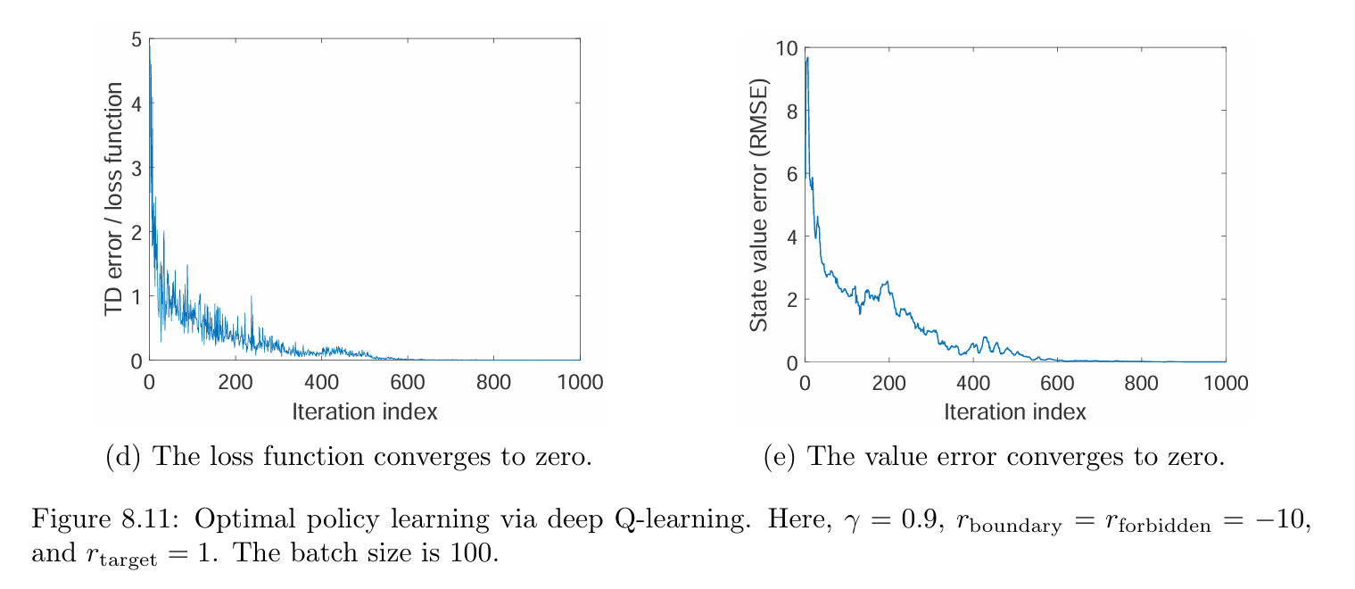 As shown in Figure 8.11(d), the loss function, defined as the average squared TD error of each mini-batch, converges to zero, meaning that the network can fit the training samples well. As shown in Figure 8.11(e), the state value estimation error also converges to zero, indicating that the estimates of the optimal action values become sufficiently accurate. Then, the corresponding greedy policy is optimal.